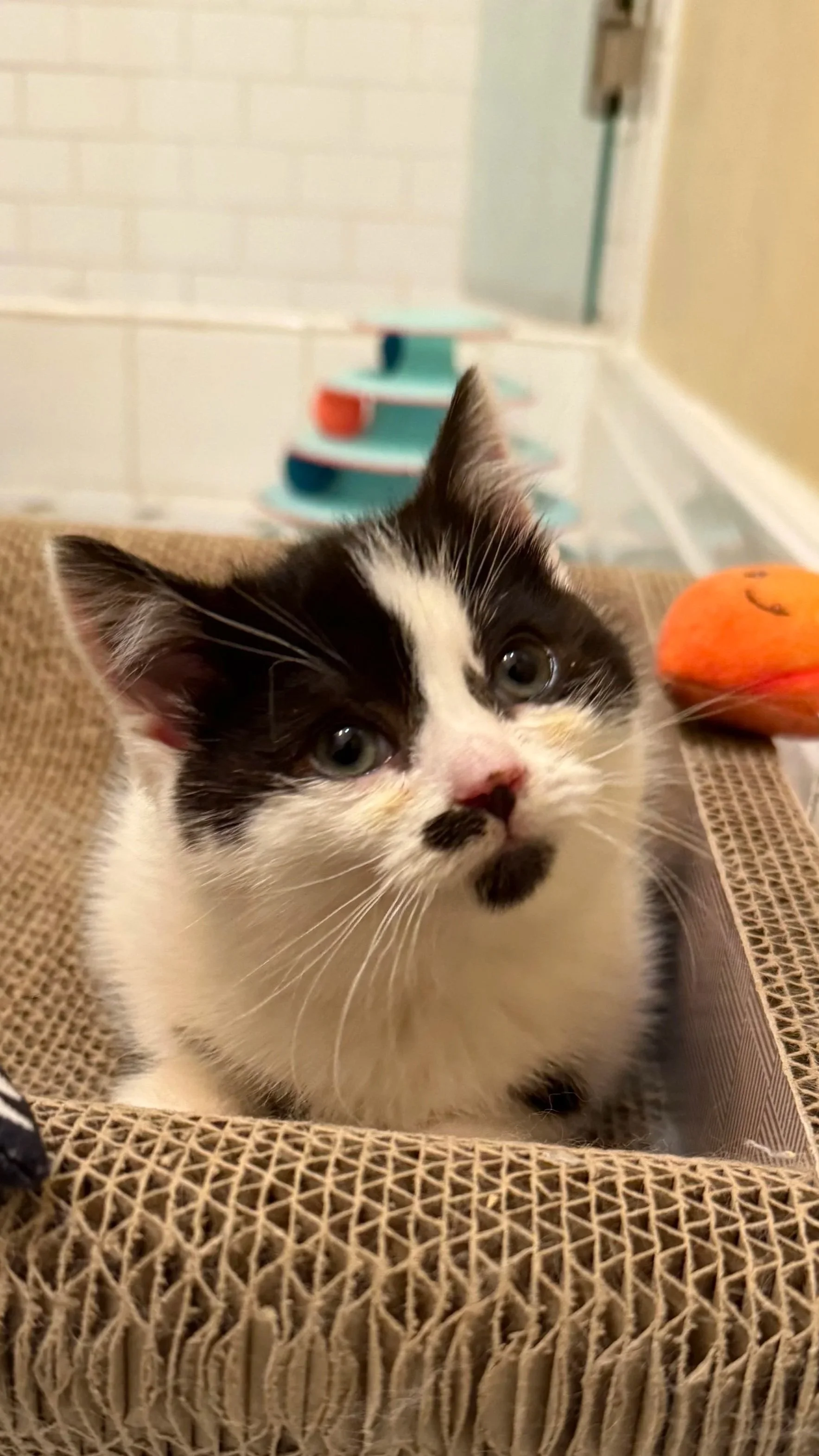 ADOPTED! Named for black-and-white ball founders Truman Capote and Katherine Graham, this tuxedo cat pair of siblings were maybe four weeks old when we found them alone outside on a cold September night. At roughly 11 weeks old (that’s an old photo), they moved in with their new loving family!